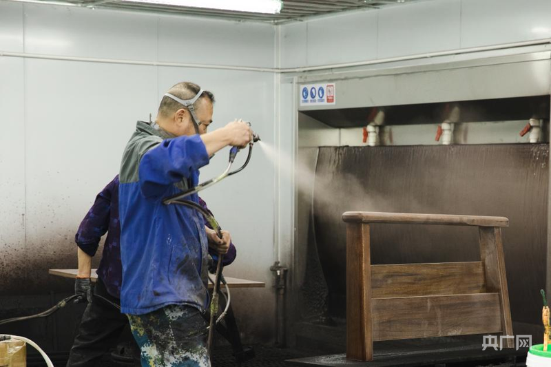 林森泰家具有限公司操作车间内工人运用水性漆喷绘家具(央广网见习记者 尹博 摄)