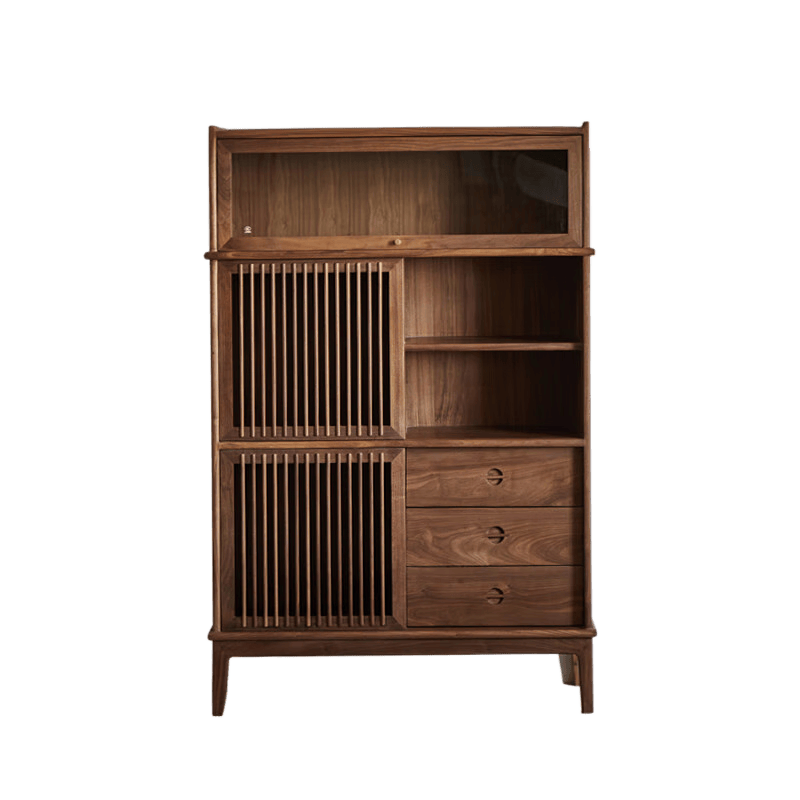 杞枝实木餐边柜以北美黑胡桃木制成,展现出新中式风格的独特魅力。其多功能设计使其不但可以作为酒柜,还能作为储物柜,完美解决了家居收纳的问题。尺寸为101*40*157cm,适合小户型空间的使用。